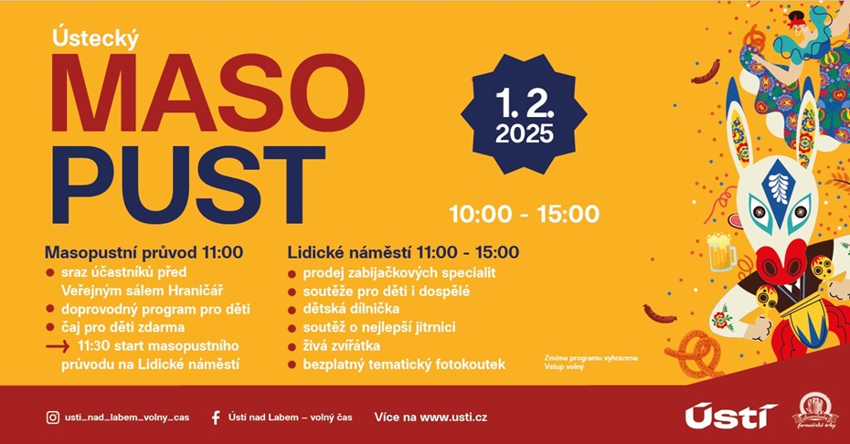 Ústí nad Labem - Opět po roce projde centrem města veselý průvod a Lidické náměstí provoní zabijačkové i další dobroty. K tomu Vás ještě čeká skvělá zábava pro děti i dospělé. Ústecký masopust proběhne v sobotu 1. 2. 2025 v čase 11:00 - 15:00.