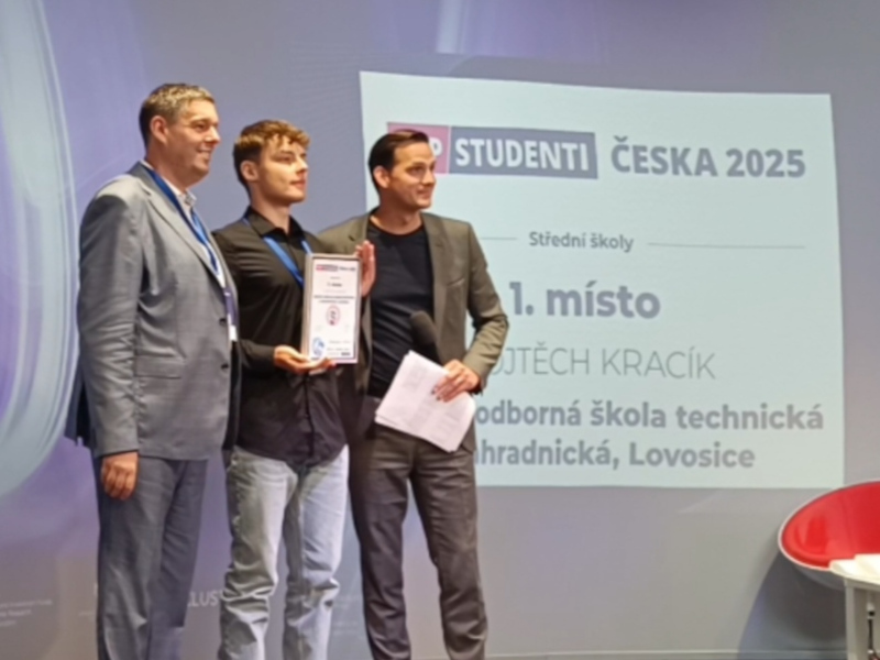 Ocenění TOP STUDENTI Česka 2025 si náš žák převzal v rámci každoroční konference ČESKObudoucnosti na půdě CIIRC ČVUT Praha. V průběhu celého dne se měl možnost potkat s celou řadou velmi výrazných a úspěšných osobností z řad ředitelů institucí, vedoucích projektů a studentů jako např. Václavem Vernerem, který získává opakovaně zlatou medaili v rámci světové chemické olympiádě IChO, držitelkou „Nobelovky pro juniory“ v matematice či členkou vítězného týmu LASAR v celosvětové soutěži NASA.
