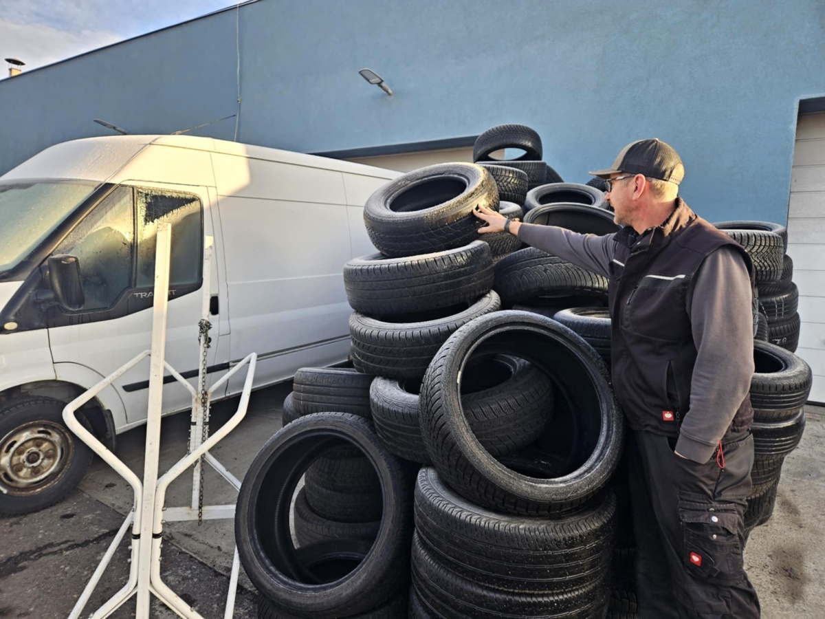 Nezřídka se ve své firmě setká i s tím, že jsou gumy tak sjeté, že z nich trčí dráty. U hromady pneumatik před garáží by mohl pořádat přednášky, co je u které gumy špatně. Foto: jip