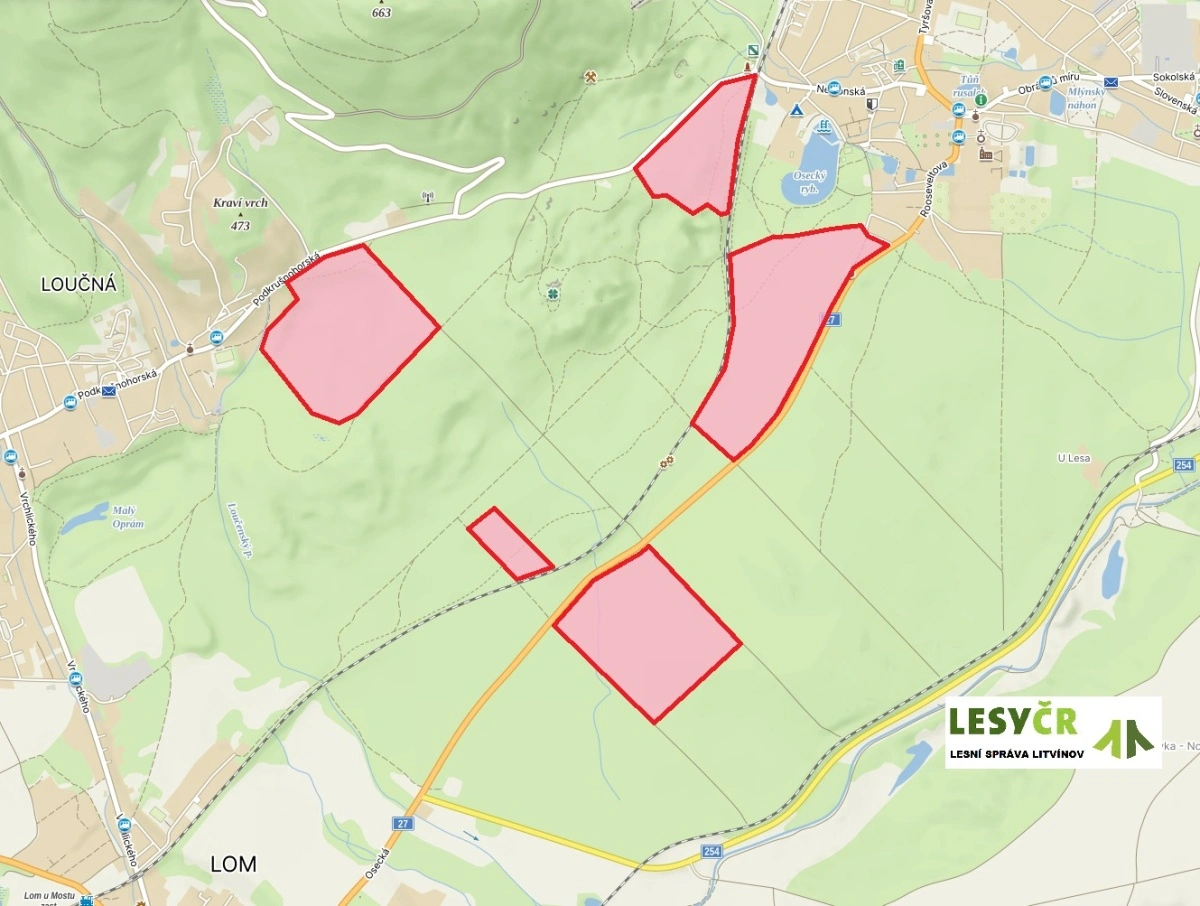 Červeně jsou vyznačeny plochy, kde probíhá či bude probíhat těžba dřeva. Zdroj: Lesní správa Litvínov