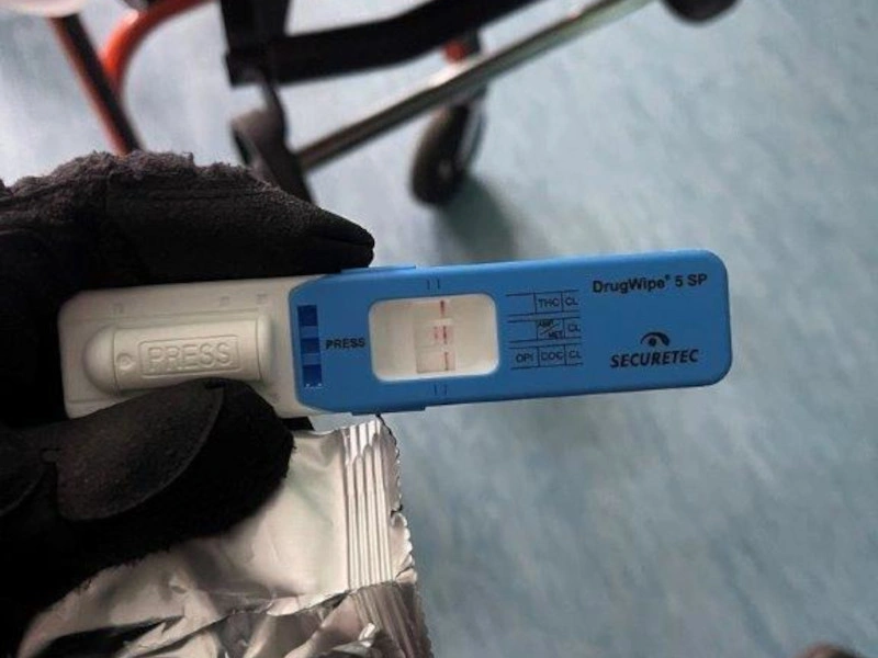 Strážníci proto použili donucovací prostředky a po krátkém zákroku muže zpacifikovali a nasadili mu pouta. Muž i nadále reagoval zmateně a byl vůči hlídce vulgární. Na místo byla přivolána hlídka Policie ČR, která u něj provedla orientační test na přítomnost omamných látek. Test byl pozitivní na metamfetamin a amfetamin.