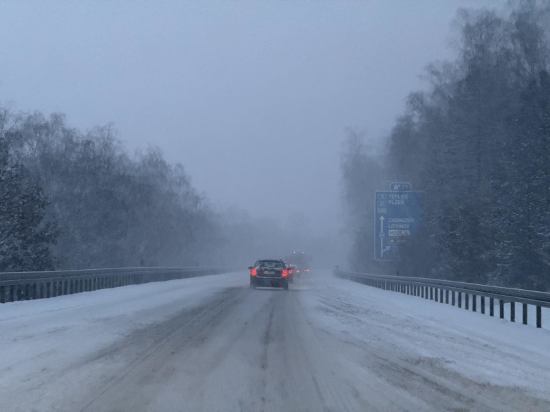 Hory – silnice I/6: Výrazné problémy jsou hlášeny z horských poloh. Od půl sedmé ráno je částečně uzavřen provoz u obce Křimov (nedaleko Hory Svatého Šebestiána). V pravém jízdním pruhu ve stoupání stojí kolona vozidel, příčinou je husté sněžení.