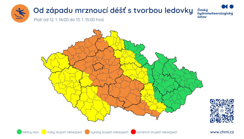 Tloušťka ledovky zejména v pásu od severozápadních Čech přes střední Čechy až na jihozápad Moravy může dosáhnout 2 až 5 mm. Na severovýchodě a východě území srážky zůstanou většinou sněhové.
