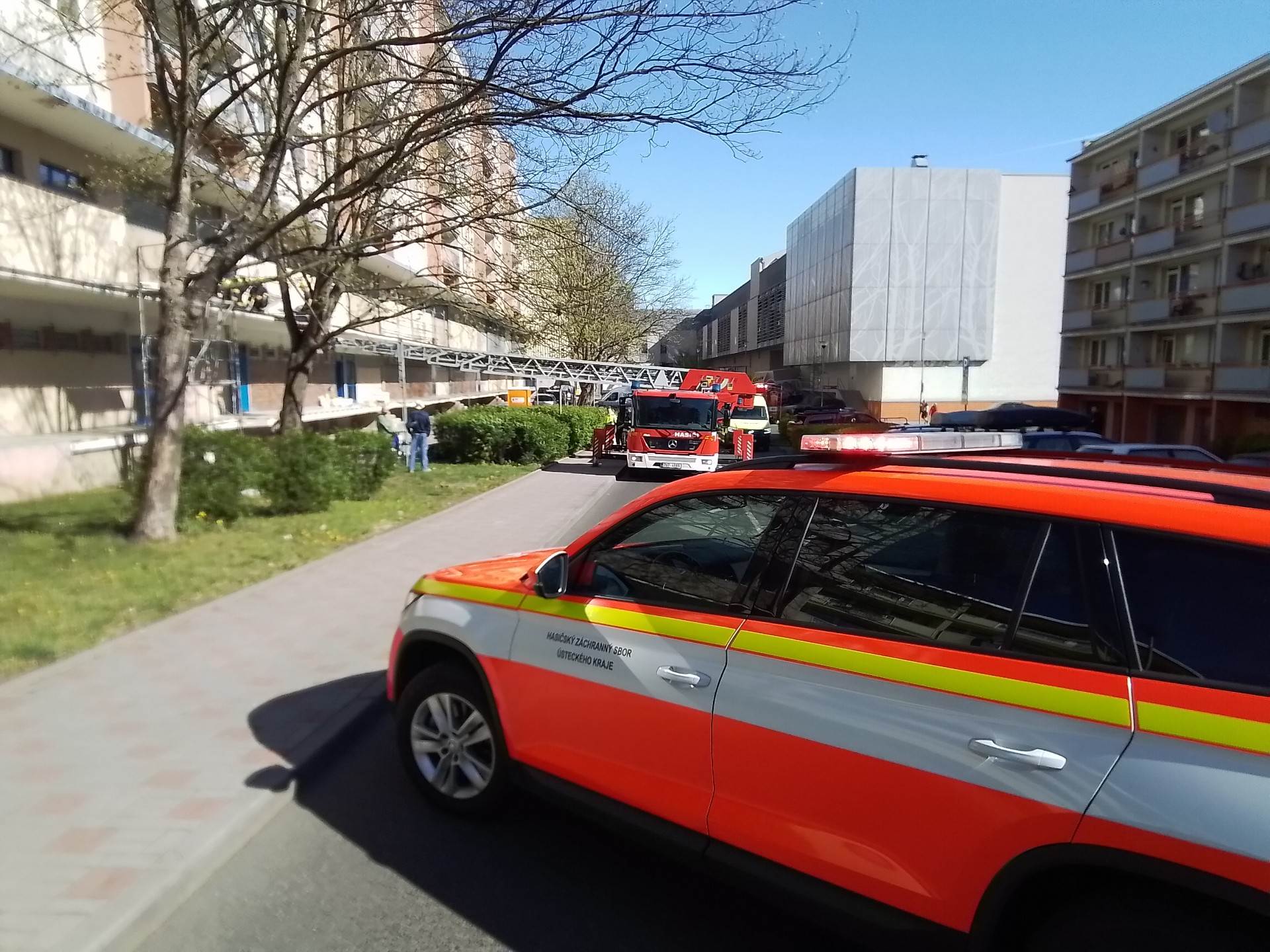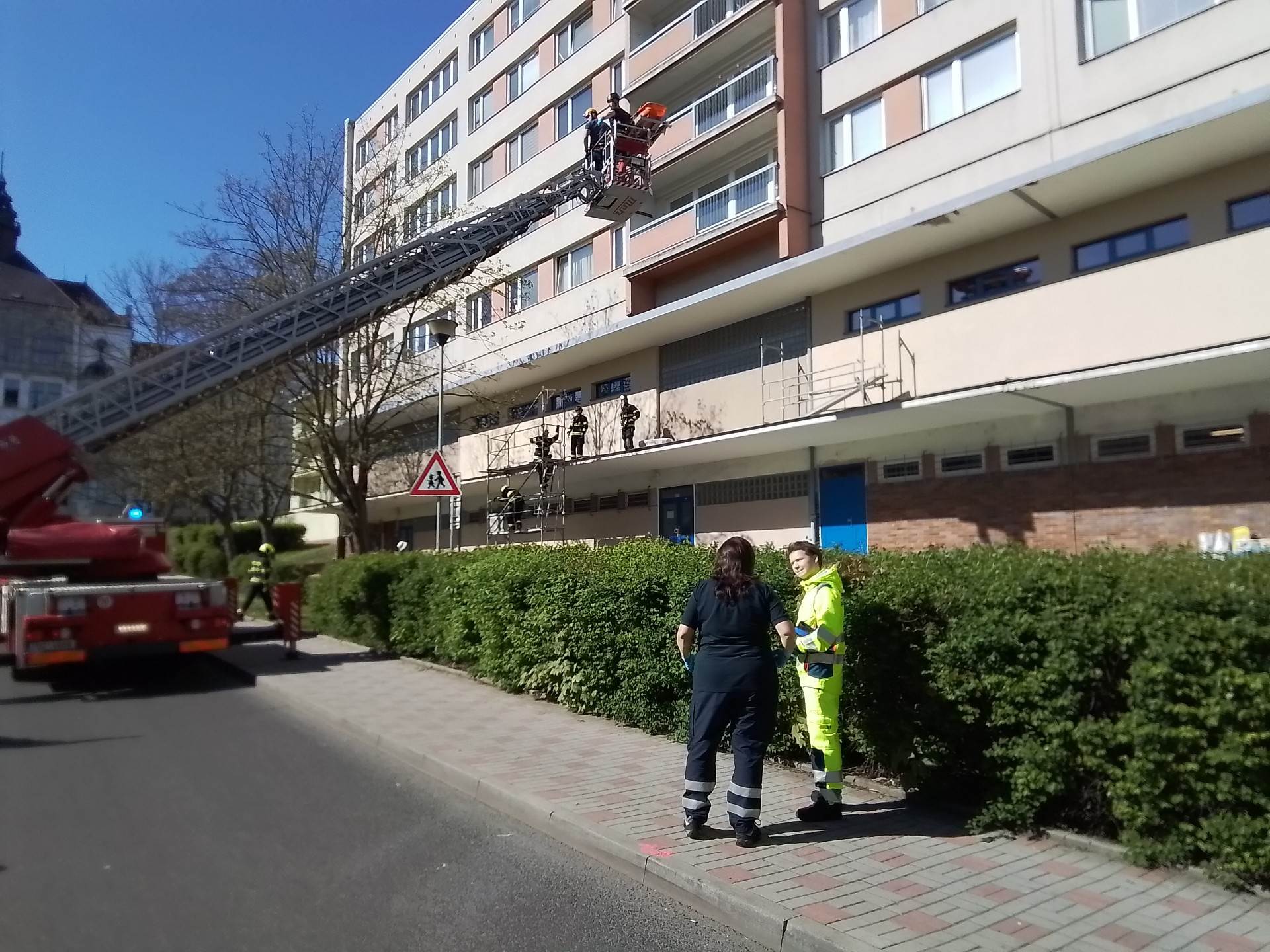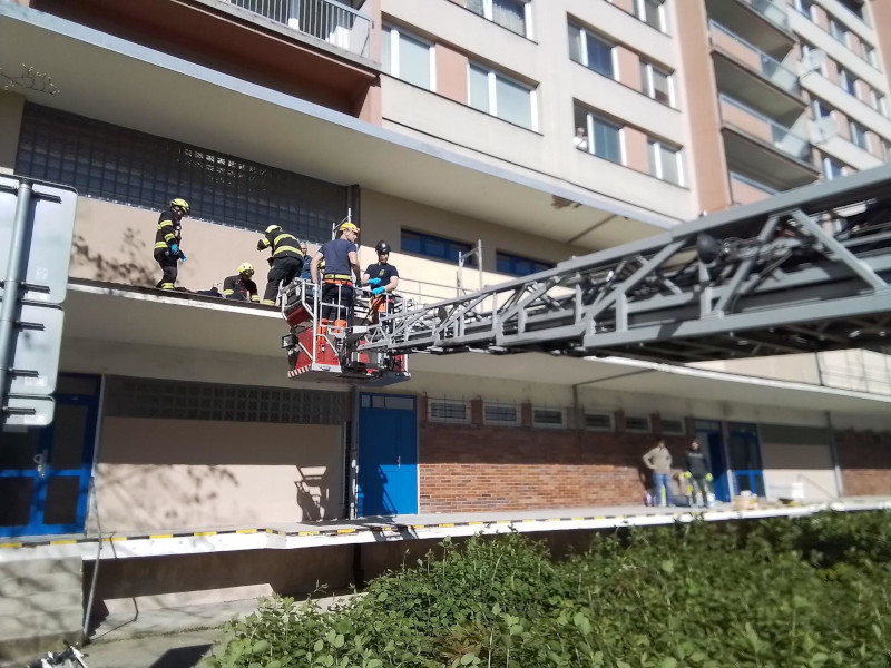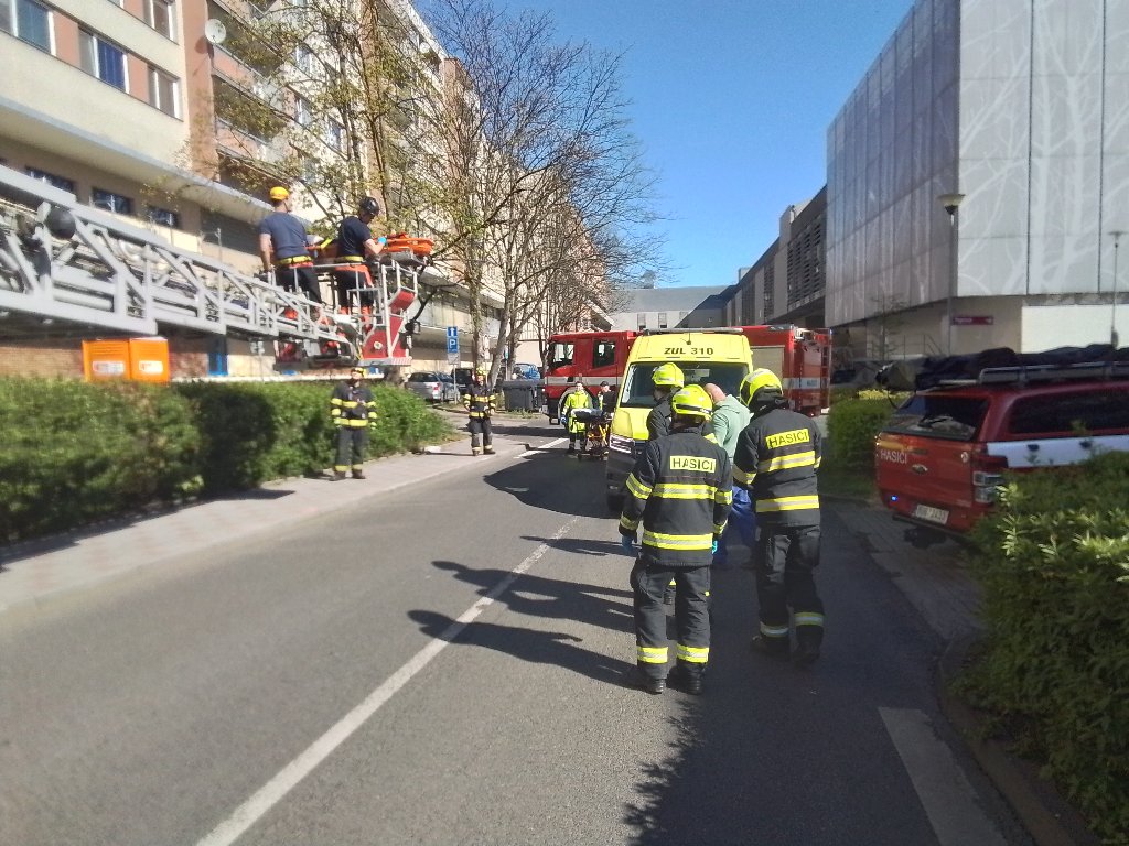 Na místo vyjížděla jednotka teplických hasičů, která musela využít výškovou techniku. Pomocí transportní vany dostali hasiči zraněného člověka bezpečně na zem. Následně byla osoba předána do péče zdravotnické záchranné služby Ústeckého kraje.