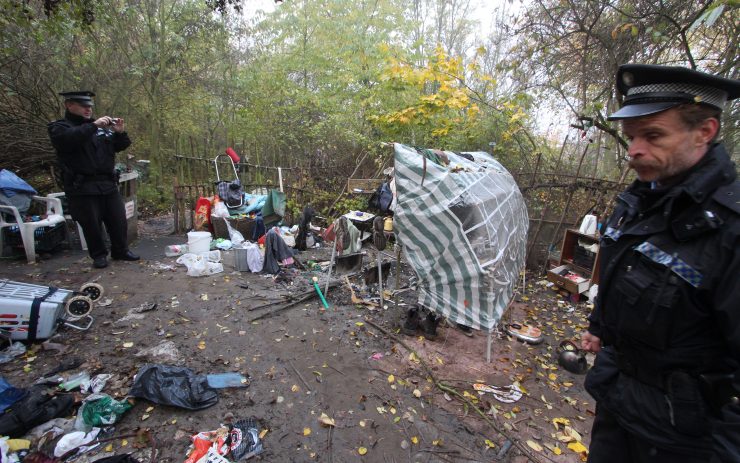 Strážníci teplické městské policie kontrolují stanový tábor bezdomovců krátce před tím, než nastoupil do akce bagr. Foto: Jan Vraný