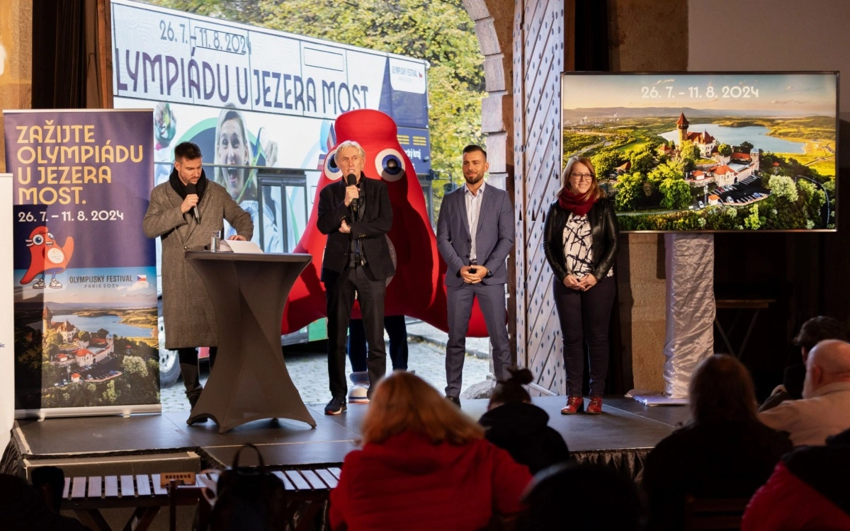 Společně s náměstkyní primátora Markétou Starou, primátorem Mostu Markem Hrvolem a Barborou Špotákovou byl na slavnostní tiskové konference i další ambasador, a to olympionik Ondřej Synek. Foto: Oldřich Hájek